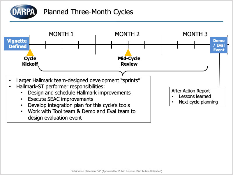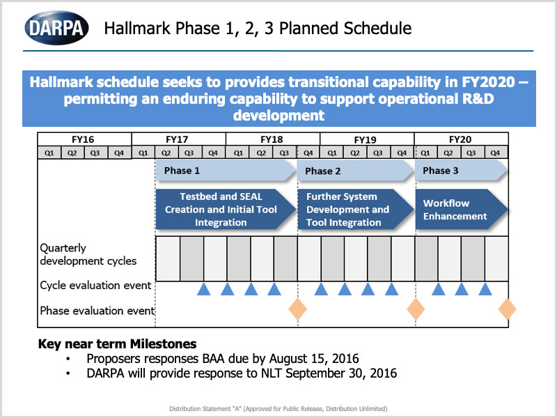 从2016年正式启动到2020年初宣布结束,Hallmark项目经历了不到5年时间,这正是DARPA项目管理的基本要求:通常在3-5年之间完成颠覆性技术的初步工作。针对于项目经理压力比较大,做不成预期的成果,该项目就要被取消。