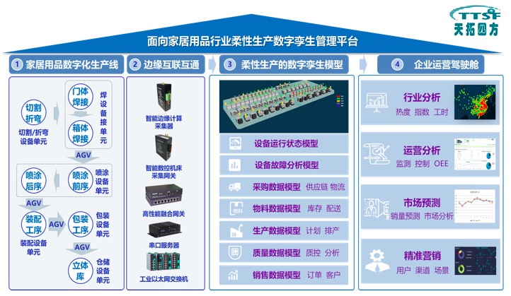 面向家居用品行业的柔性生产数字孪生管理平台解决方案基于各业务场景的有效打通,提升企业生产计划管控与协同制造能力。解决方案可覆盖企业设计、工艺、制造、库存、物流、服务等管理环节的功能,实现产品全生命周期闭环动态优化。