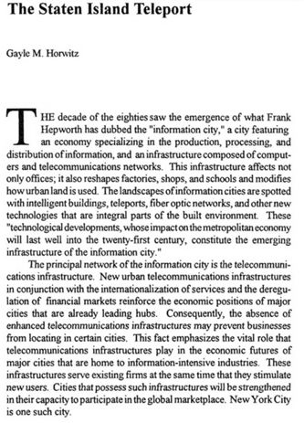 上世纪八十年代后半期我在上海市电子振兴领导小组办公室工作,改革开放使得我们与世界的交流越来越广泛而深入。那时我得到了关于纽约未来发展的想法,文章分析了纽约市的电信基础设施,并将重点放在了斯塔顿岛的Teleport上。Teleport,字面上可翻为“传输港”,我把它翻译成远程通信港。他们认为因为有了航海技术才诞生和发展了纽约港,但是现在远程通信技术使纽约的未来受到了挑战,纽约的未来必须从物质交换的港口城市走向信息交换的港口城市!当时远程通信的技术的顶峰是大容量卫星通信,Teleport在上世纪80年代中期由纽约市政府和纽约港务局(PANYNJ)开发,专注于新技术,并通过卫星和光纤连通性提供高速语音、数据和视频服务。