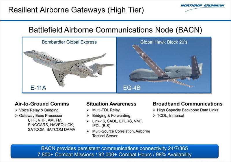 战场机载通信节点也安装在一些RQ-4无人驾驶空中系统上,这是美国空军计划退役的无人机。