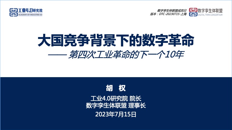 工业4.0研究院院长、数字孪生体联盟理事长胡权做了主题分享,题目为《大国竞争背景下的数字革命:第四次工业革命的下一个10年》。
