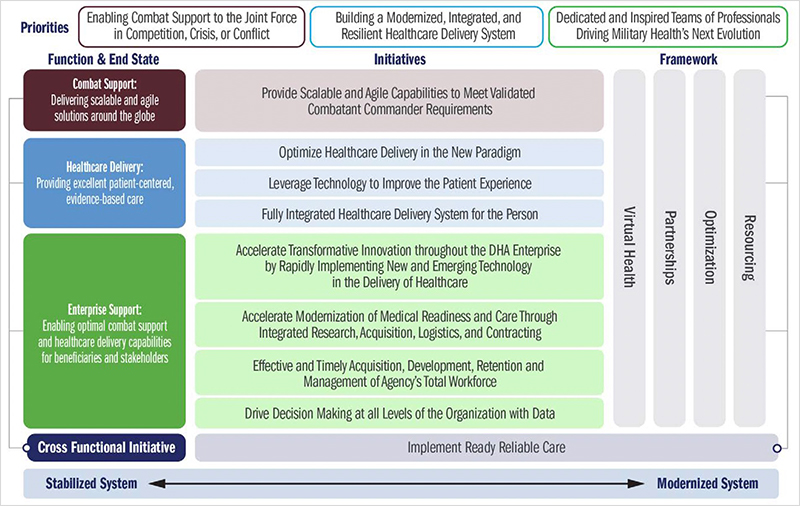 作为一个强大的战略合作伙伴,国防卫生局在竞争、危机或冲突中的连续军事行动中,实现适应性强、综合性强、反应迅速和有弹性的医疗能力。