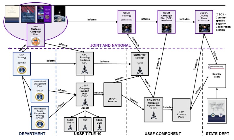 这份20页的报告,根本目标是为了支撑联合战略作战计划,要求关注“地理作战司令部”(GCC,Geographic Combatant Commands)。为了说明多个文件的关系,认清这份文件在太空部队的地位,报告还专门画了一张图。
